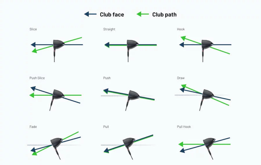 - 挥杆轨迹和杆面方向之间的差异决定了球的弯曲程度。(球会朝着相对于杆面的挥杆轨迹的相反方向弯曲)