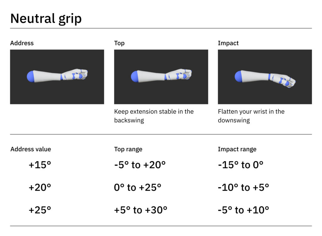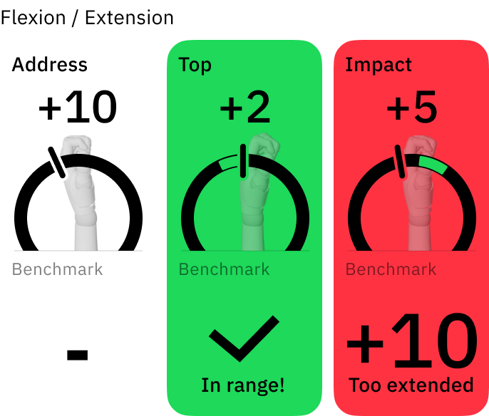 如果你尽管在上杆顶点位置手腕弯曲过度,但仍能始终如一地达到良好的击球瞬间位置,那么你可以在设置中自定义这些范围。这使你能够调整参数以匹配你特定的挥杆动作,同时仍然能从HackMotion传感器获得准确的反馈。